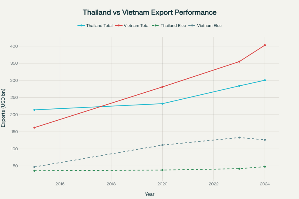 Thailand, conversely, maintains a more diversified export structure including electronics, machinery, tourism, agriculture, and chemicals. While such diversification should theoretically provide a more stable industrial base, under conditions of general weakening world demand, it makes Thailand more susceptible to negative trends in many industries simultaneously.