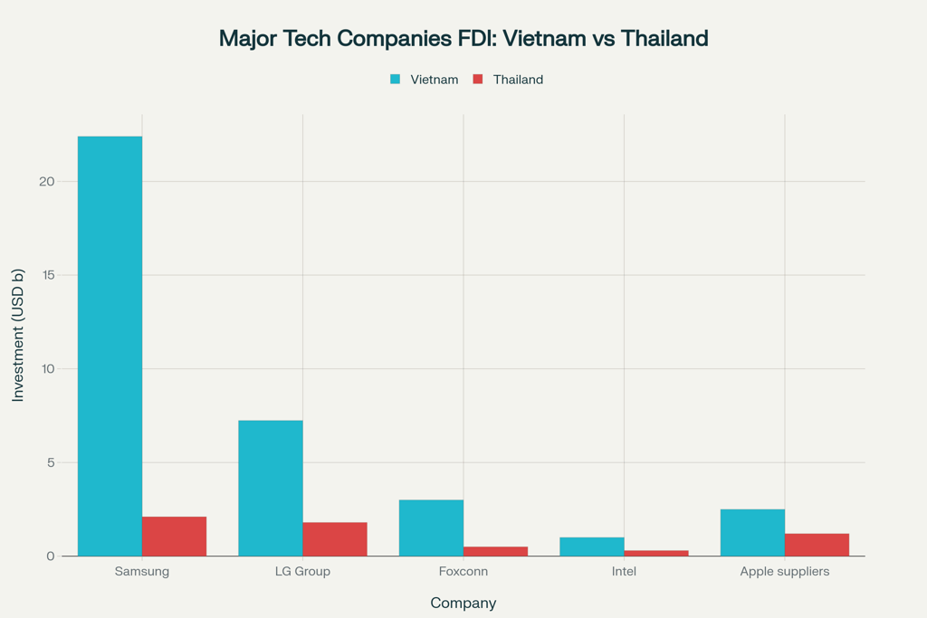 Foreign direct investment became the catalyst for Vietnam's economic miracle. Total FDI volume from major technology companies in Vietnam significantly exceeds similar investments in Thailand. Samsung invested 22.4 billion dollars in Vietnam versus 2.1 billion in Thailand, LG Group - 7.24 billion versus 1.8 billion respectively.