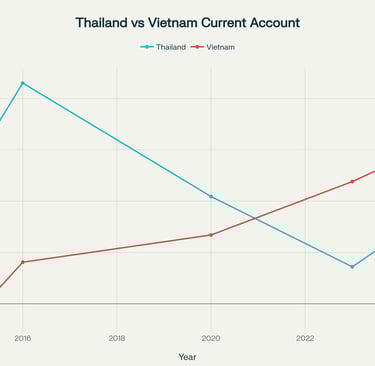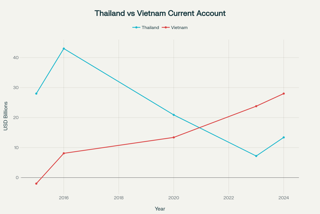 This transformation reflects fundamental changes in export sector competitiveness of both countries. Current account surplus exceeding 6% of GDP in Vietnam versus 2.5% in Thailand indicates that Vietnam's economy generates significantly more foreign exchange earnings relative to its size.